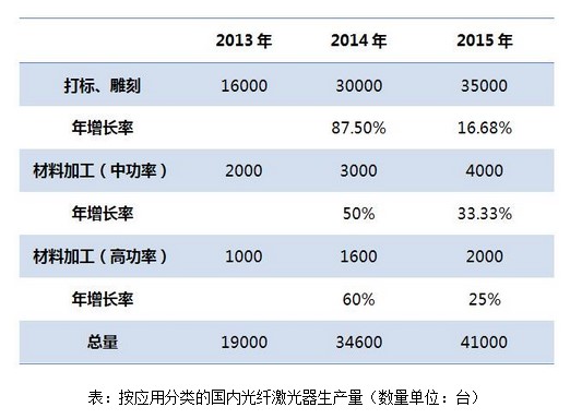 打標(biāo) / 雕刻市場(chǎng)進(jìn)入溫和增長(zhǎng)階段 中國(guó)進(jìn)入光纖激光市場(chǎng)起步晚,發(fā)展快,直接表現(xiàn)在打標(biāo)/雕刻領(lǐng)域,因激光器的可持續(xù)性和實(shí)用性等優(yōu)勢(shì),2013-2014年國(guó)內(nèi)激光打標(biāo)技術(shù)取代傳統(tǒng)的標(biāo)識(shí)技術(shù)的條件相對(duì)成熟,2014年打標(biāo)/雕刻市場(chǎng)產(chǎn)量相比2013年實(shí)現(xiàn)87%的增長(zhǎng),而在歷經(jīng)兩年爆發(fā)式增長(zhǎng)后,國(guó)內(nèi)光纖激光器市場(chǎng)生態(tài)環(huán)境逐漸穩(wěn)定,2015年打標(biāo)/雕刻市場(chǎng)進(jìn)入增長(zhǎng)放緩階段。 中功率材料加工市場(chǎng)將保持穩(wěn)健增長(zhǎng) 在產(chǎn)量上,2014年中功率材料市場(chǎng)相較2013年增長(zhǎng)50%,2013-2014年是激光市場(chǎng)格局基本成型時(shí)期,因2015年受世界主要經(jīng)濟(jì)體需求影響,工業(yè)市場(chǎng)熱度下降,因此中功率市場(chǎng)增長(zhǎng)速度有一定回落,但仍保持33%左右的增長(zhǎng)。下游設(shè)備加工應(yīng)用需求迫切,電子、航空、通訊、信息處理等制造領(lǐng)域應(yīng)用深入,中高功率光纖器將成為國(guó)內(nèi)光纖市場(chǎng)的未來(lái)發(fā)展趨勢(shì)。 高功率材料加工市場(chǎng)發(fā)展空間較大 2013年-2015年期間,高功率材料加工市場(chǎng)在產(chǎn)量值上已實(shí)現(xiàn)翻倍增長(zhǎng),從2013年增至1000臺(tái)增至2015年的2000臺(tái)。先進(jìn)激光制造技術(shù)的主要發(fā)展方向是高功率、高光束質(zhì)量、高智能化等,這一發(fā)展方向已成為國(guó)內(nèi)外業(yè)界的發(fā)展共識(shí),未來(lái)光纖激光器市場(chǎng)份額將以高功率材料加工領(lǐng)域?yàn)橹饕鲩L(zhǎng)來(lái)源。