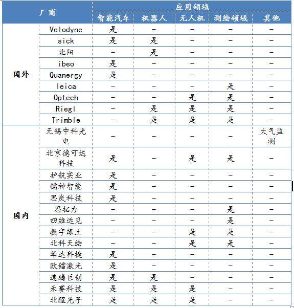 由于固態(tài)式激光雷達,不具備旋轉(zhuǎn)組件,這在一定程度降低了硬件成本和磨損消耗,且在個別光束陣元損壞的前提下,固態(tài)式激光雷達整體仍可持續(xù)工作,在可靠性上實現(xiàn)了大大提升。 二、激光雷達的主要應(yīng)用領(lǐng)域 激光雷達的下游應(yīng)用領(lǐng)域核心是掃地機器人、AVG小車、汽車自動駕駛、無人駕駛、空間測繪和無人機等領(lǐng)域。從目前全球激光雷達企業(yè)的下游應(yīng)用領(lǐng)域分布來看,居多的仍然是智能汽車和機器人領(lǐng)域。