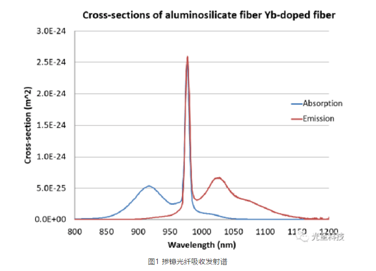 目前摻鐿光纖激光器主要的泵浦波長有三種,即915nm、976nm和1018nm,其中前兩種主要在工業(yè)產(chǎn)品中使用,最后一種目前主要用于超高單纖功率科研產(chǎn)品中。摻鐿光纖激光器的泵浦波長的選擇主要是由摻鐿光纖(YDF)的吸收發(fā)射譜所決定的,如圖1所示。