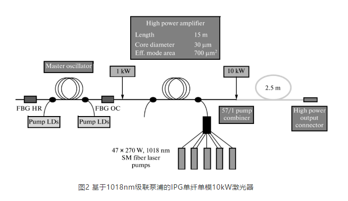 隨著激光器功率的不斷提升,常規(guī)的半導(dǎo)體泵浦亮度已經(jīng)很難滿足要求超高功率單纖輸出的要求,IPG最早提出了基于1018nm級(jí)聯(lián)泵浦方案,并基于此方案實(shí)現(xiàn)了單纖20kW的功率輸出,如圖2所示。1018nm級(jí)聯(lián)泵浦的基本思路是,先利用976nm的半導(dǎo)體激光泵浦產(chǎn)生1018nm激光,將激光亮度提升數(shù)個(gè)量級(jí),然后再將1018nm激光進(jìn)行合束,并用于泵浦1080nm的激光,單纖激光器功率提升的泵浦亮度限制被打開。