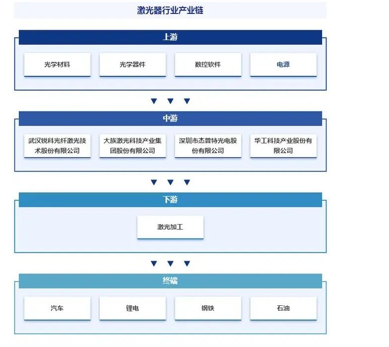 激光器行業產業鏈上游主要涉及激光器原材料的生產和供應,包括光學材料、光學器件、數控軟件、電源器件等。產業鏈中游主要為激光器的制造。產業鏈下游主要為激光加工,終端應用覆蓋汽車、鋰電、鋼鐵、石油、航空、醫療、光伏、軍事、電子、通信等廣泛領域。
