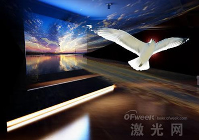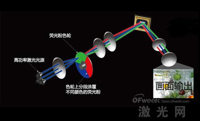 OFweek激光網(wǎng)訊:2014年,電視技術(shù)由以前“單一性”變成了“多樣化”,曲面液晶電視讓用戶有更多的選擇,全新的觀看方式給用戶身臨其境的視覺體驗;LG孜孜不倦的耕耘OLED電視總有獲得回報的一天;量子點QLED盡管只是過渡技術(shù),但同樣值得關(guān)注,畢竟液晶還將存活于市場中很多年;激光電視則是高端玩家的另一個選擇。即將到來的2015年,我們希望電視技術(shù)能夠進一步得到發(fā)展和應用。 激光電視由激光電視主機和屏體兩個部分組成,兩者的關(guān)系密不可分。和投影機產(chǎn)品不同的是,激光電視是以激光為光源,并不再需要以燈泡為光源。從下面的圖片中,大家就可以了解到激光電視的工作原理。首先是使用極高功率的激光光源,在每平方米聚集超過100W的光能量。直觀的說,100W的光能量,足以瞬間讓玻璃和鋼鐵完全融化。因此高能量密度是實現(xiàn)激光電視光源高亮度的關(guān)鍵所在,否則就無法顯示足夠亮度的畫面。 激光電視工作原理示意圖 高速旋轉(zhuǎn)的熒光粉色輪,也是激光電視所必備的。在色輪上,分段涂有不同顏色的熒光粉。當色輪高速旋轉(zhuǎn)的同時,就可以實現(xiàn)不同基色光的發(fā)射,我們就可以看到五顏六色的畫面。而前面我們提到了,由于高功率激光光源的存在,足以瞬間將鋼鐵融化。因此高速旋轉(zhuǎn)的色輪還擔負著另外一項非常重要的功能,那就是讓熒光粉的溫度快速降低,從而避免被高功率激光破壞,已達到正常發(fā)光的目的。